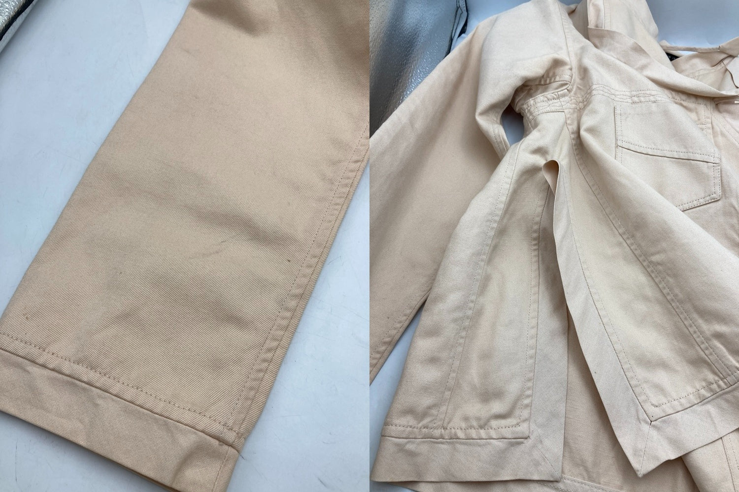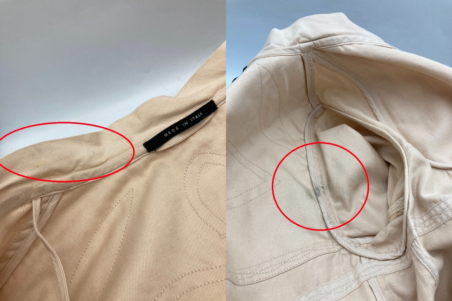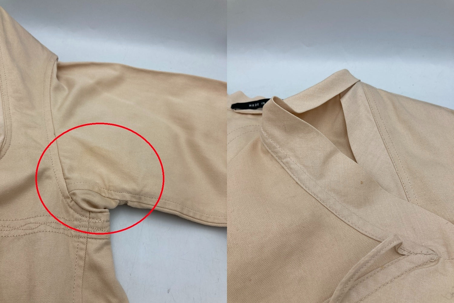 着用感がございます。 袖口、脇に大きめのシミ、裏側脇部分に黒い汚れ、細かな小さいシミや汚れが多数ございます。 |