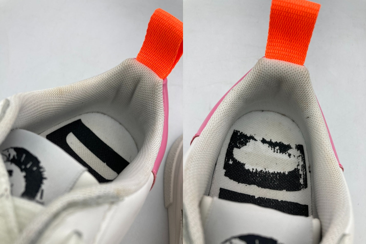 履き口に汚れがございます。 中敷きのロゴが経年劣化でボロボロと剥がれます。中敷きが取り外せないタイプですのでご注意ください。 箱にダメージがございます。 |