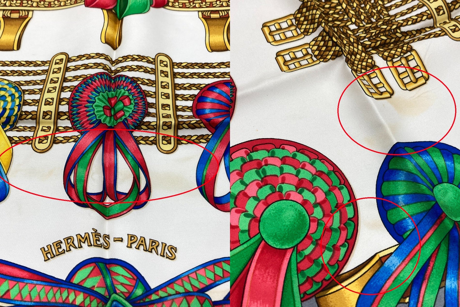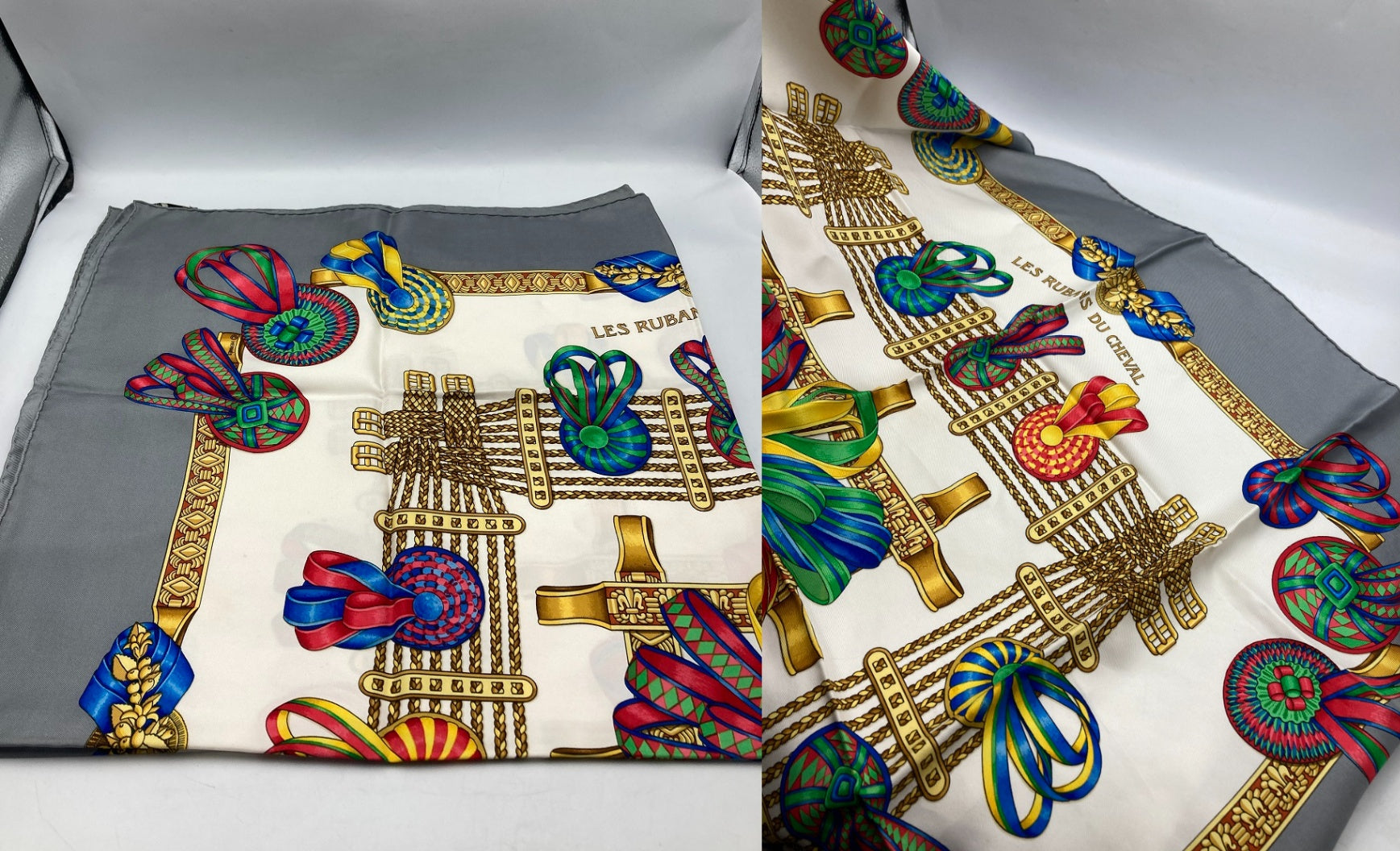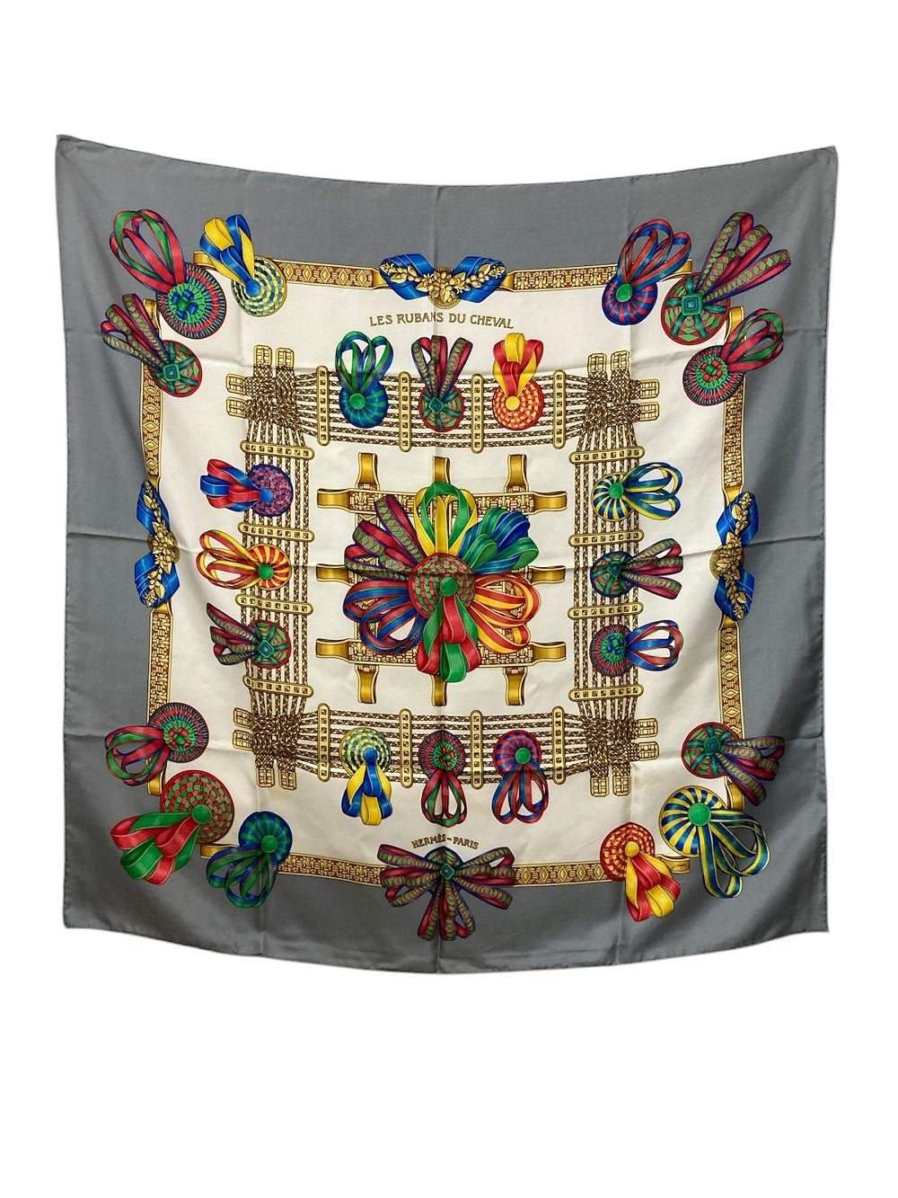 HERMES エルメス カレ90 LES RUBANS DU CHEVAL 馬のリボン スカーフ グレー 中古 D4