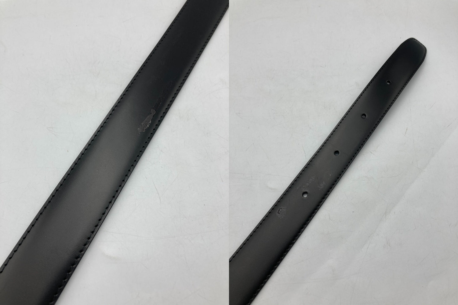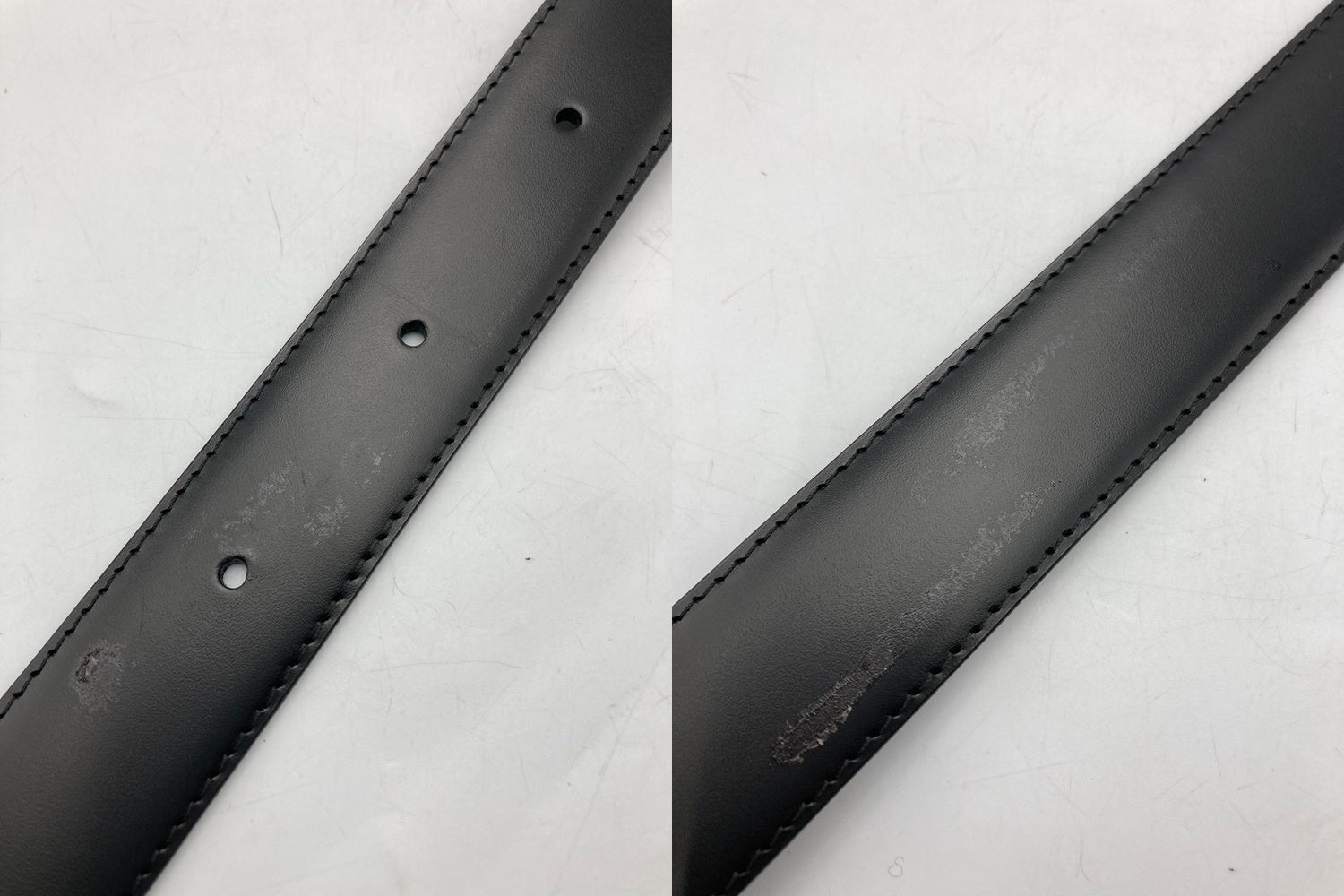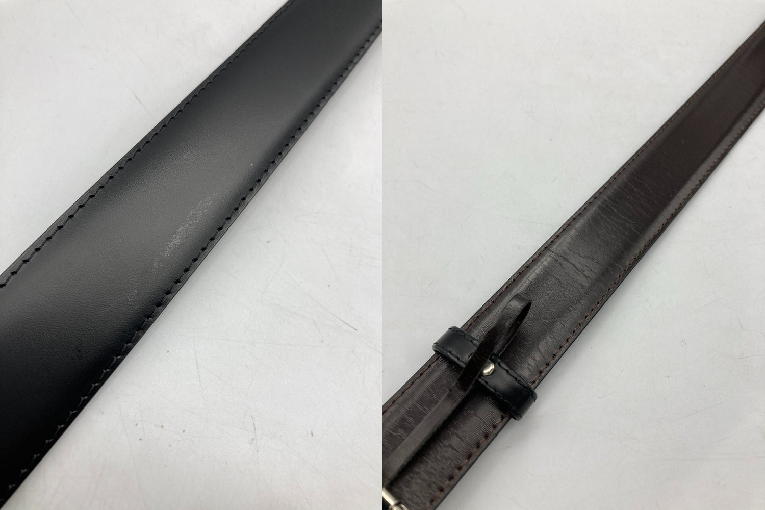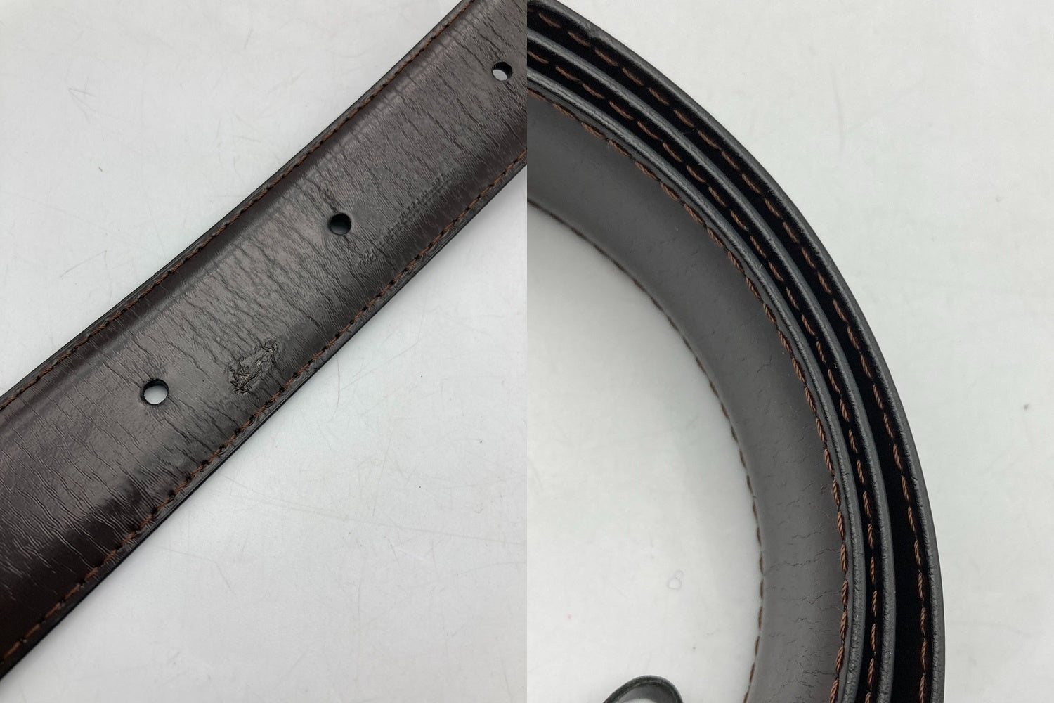 バックルに少し変色がございます。 レザー部分にキズや汚れ、何かの付着跡、シワがございます。 |