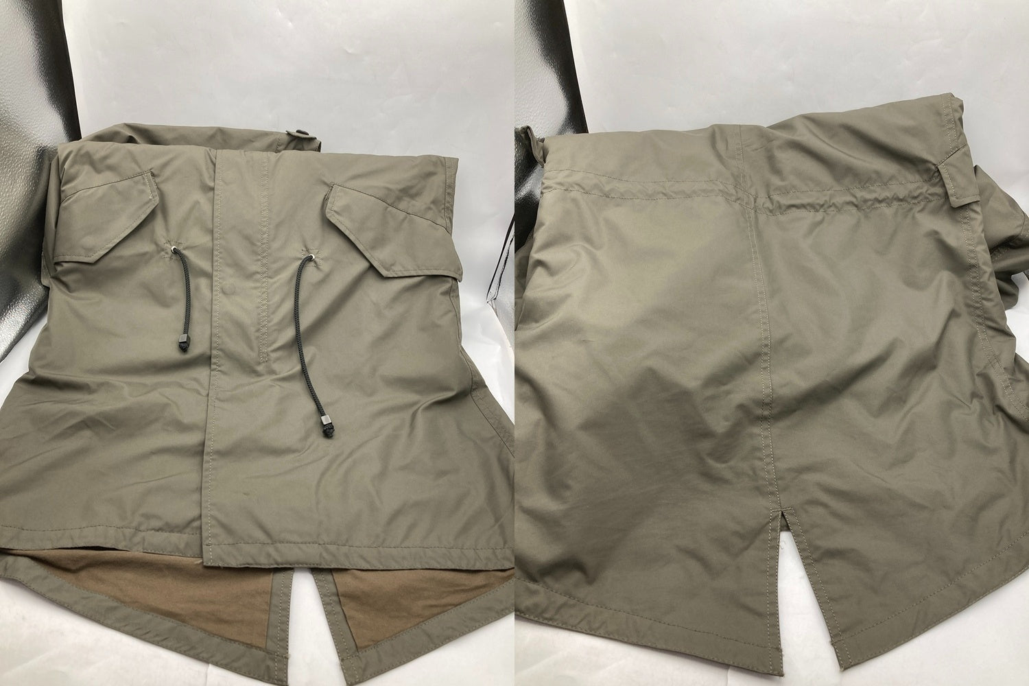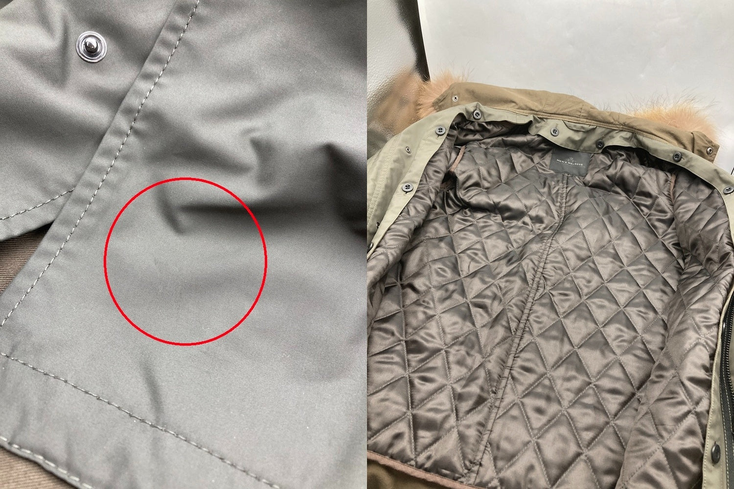 | 素材 | 表地、背裏:ポリエステル100%、袖裏:綿100%、ライナー:表地ポリエステル100%、中綿ポリエステル100%、ファー:タヌキ | |