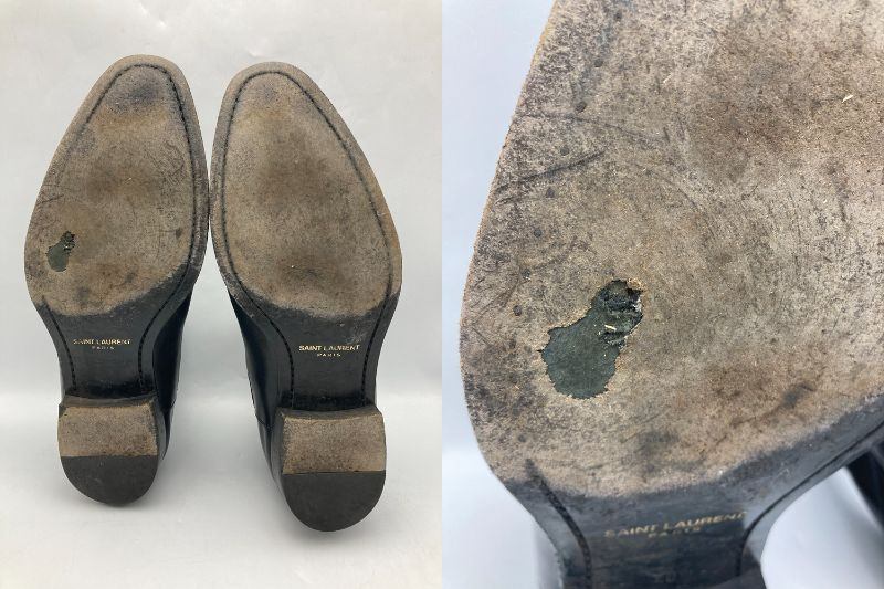 キズやダメージ、汚れがございます。 貫通はしておりませんが、ソールに穴あき、ヒールの減りがございます。 履きジワ、型崩れ、サイドゴムの伸びがございます。 |