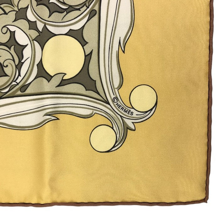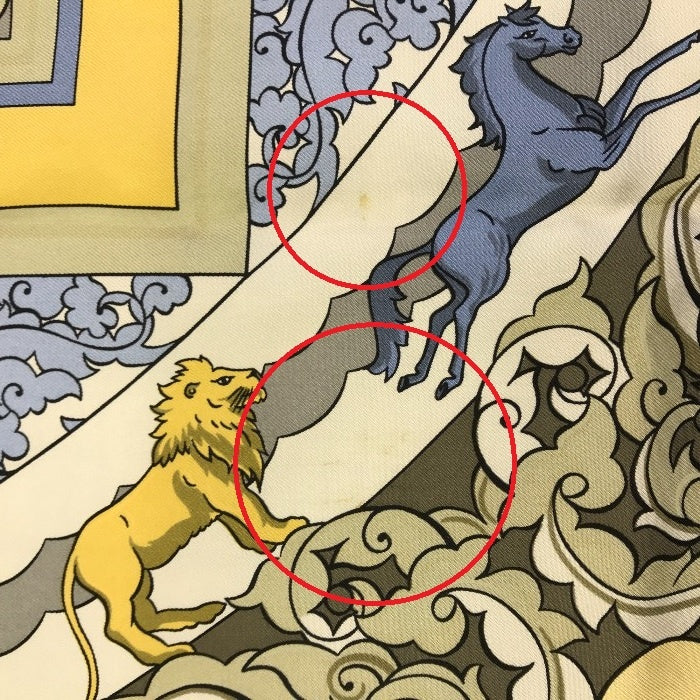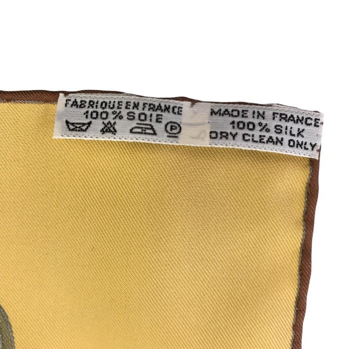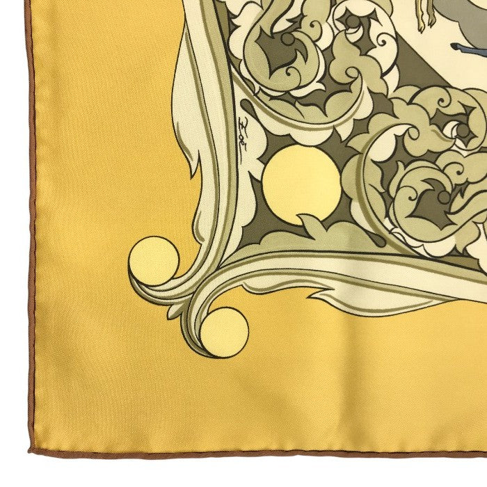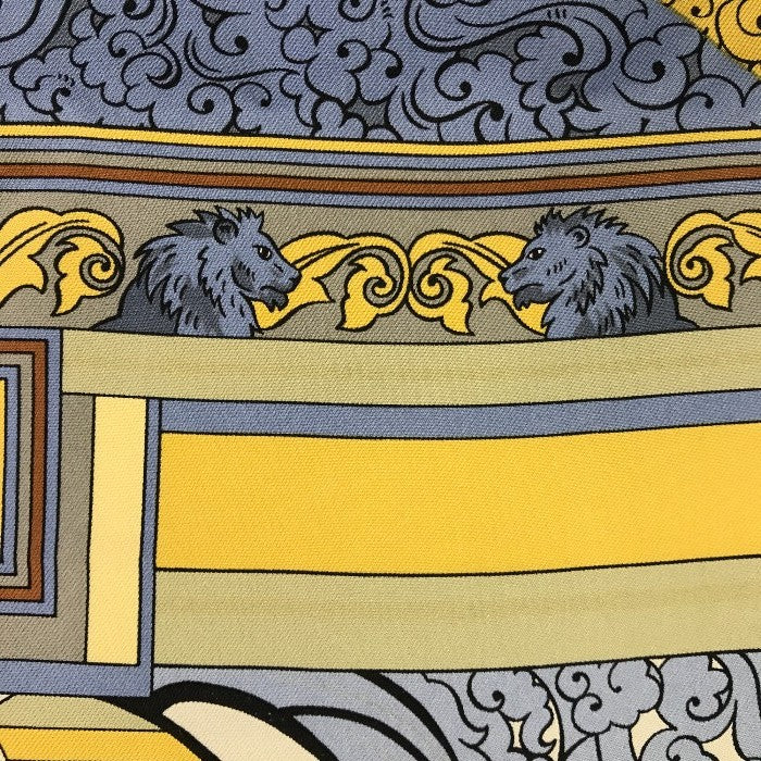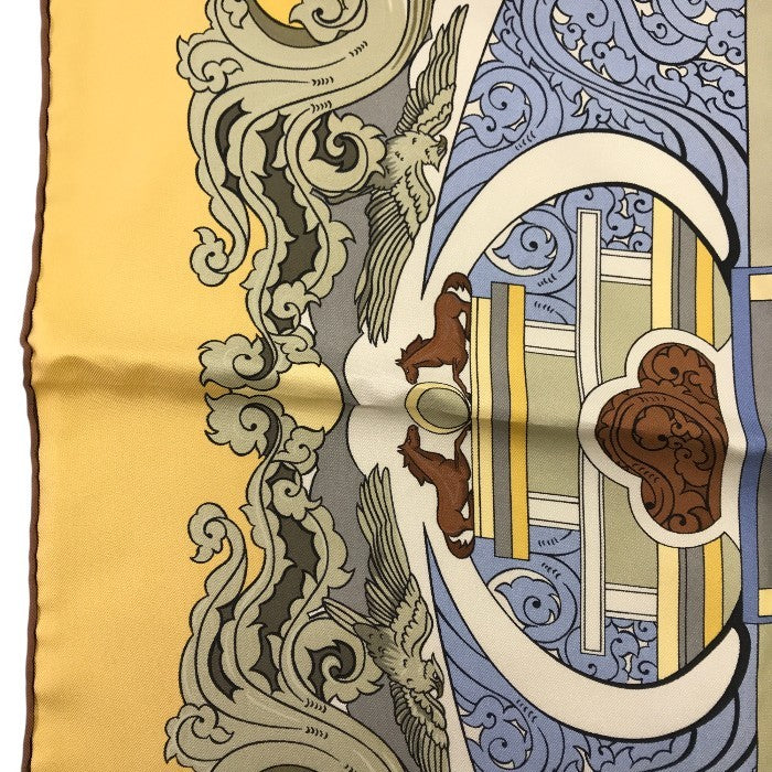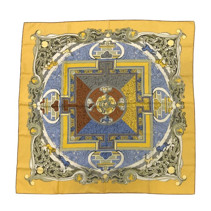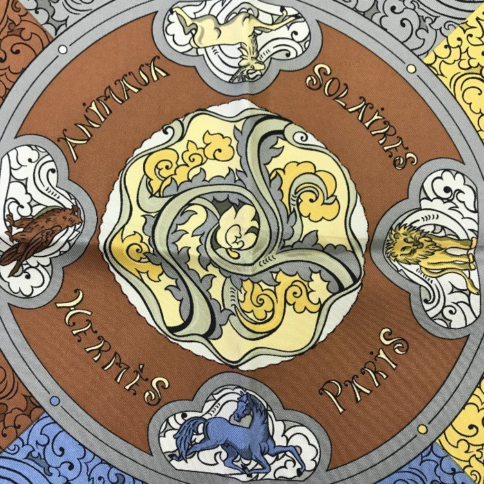 HERMES エルメス カレ90 ANIMAUX SOLAIRES 太陽の動物たち スカーフ レディース シルク 馬 ライオン 鷹 鹿 イエロー/ブルー/ブラウン 中古 T1