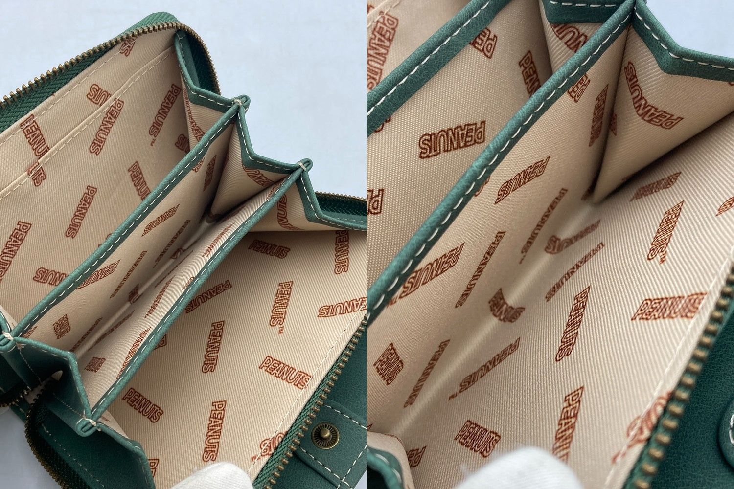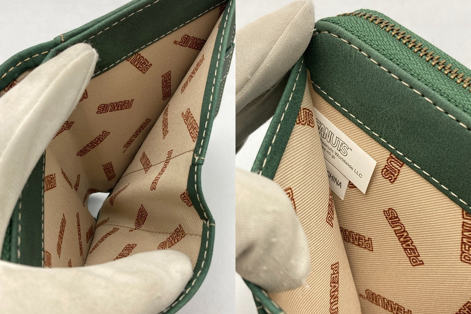 SNOOPY スヌーピー 2つ折り財布 コンパクト ラウンドファスナー 刺繍 グリーン 中古 D4