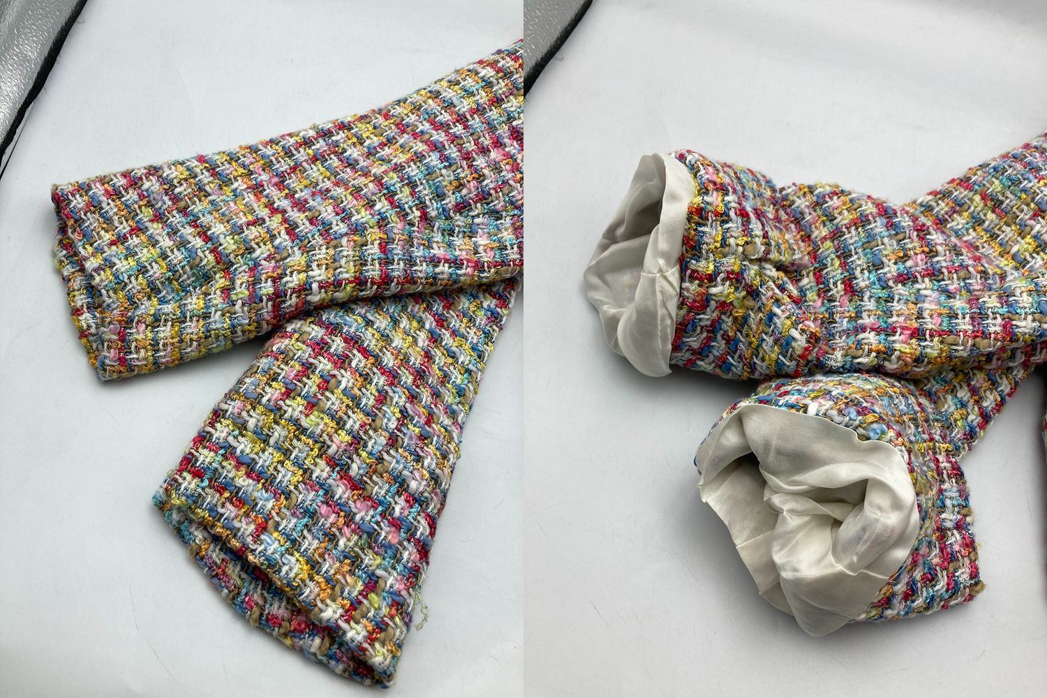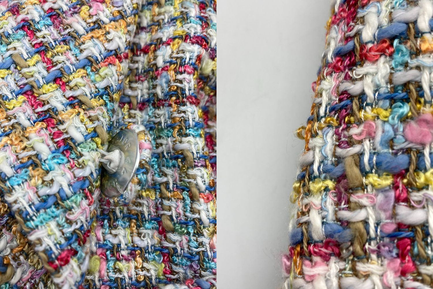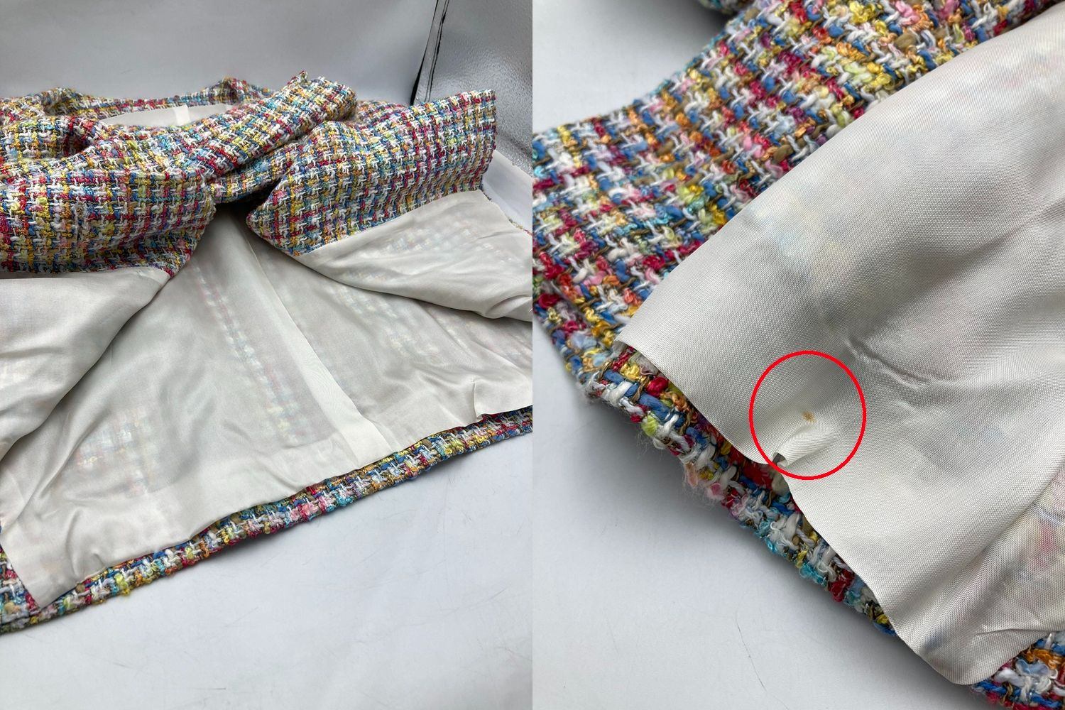 毛羽立ちや糸の飛び出しがございます。 裏地に1ヶ所シミがございます。 ボタンの縫製が緩めです。 |