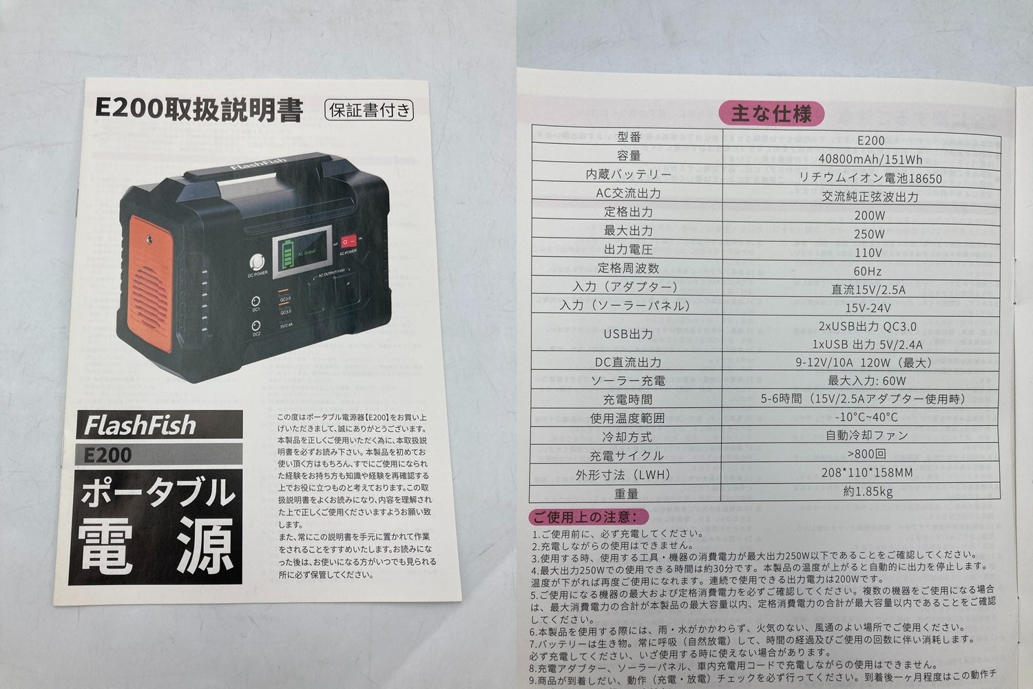 FlashFish ポータブル電源 小型発電機 E200 40800mAh/151wh AC(200W 瞬間最大250W) DC(120W) 中古 D4