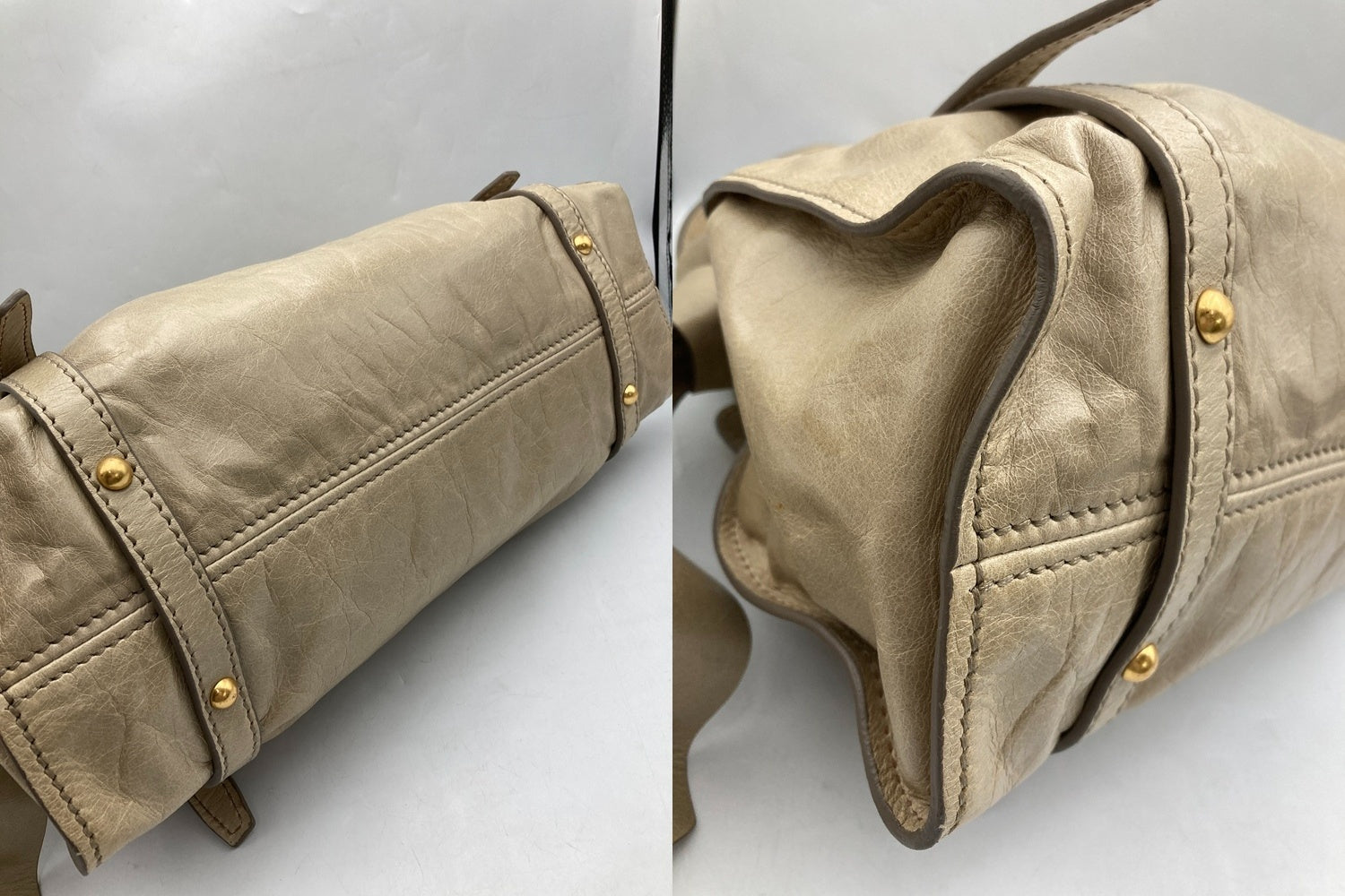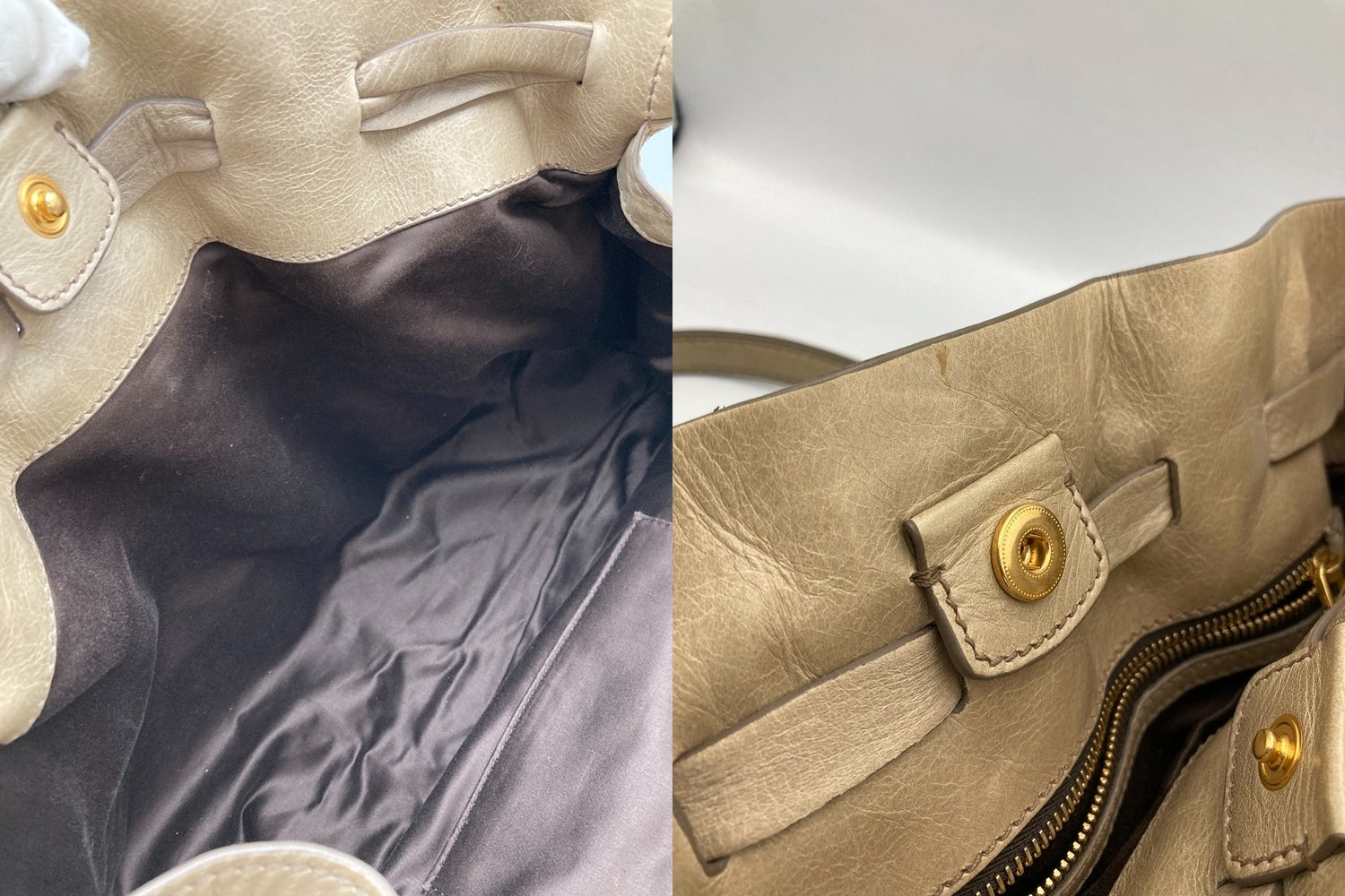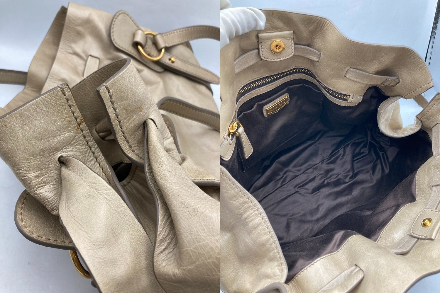 キズや汚れ、シミ等がございます。 入れ口のフチのコーティングに破れがございます。 型崩れや保管によるレザーの曲がり癖がございます。 |