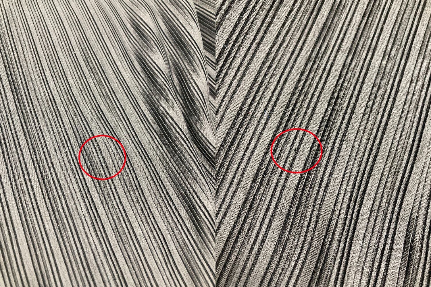 着用感や毛羽立ちがございます。 前身頃中央付近に白い汚れ、やや右よりの裾から27cmの位置に小穴がございます。 生地の端に毛玉がございます。 |