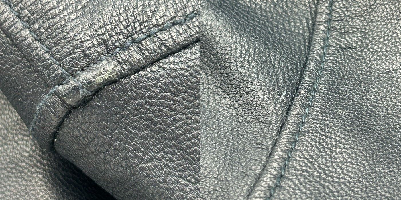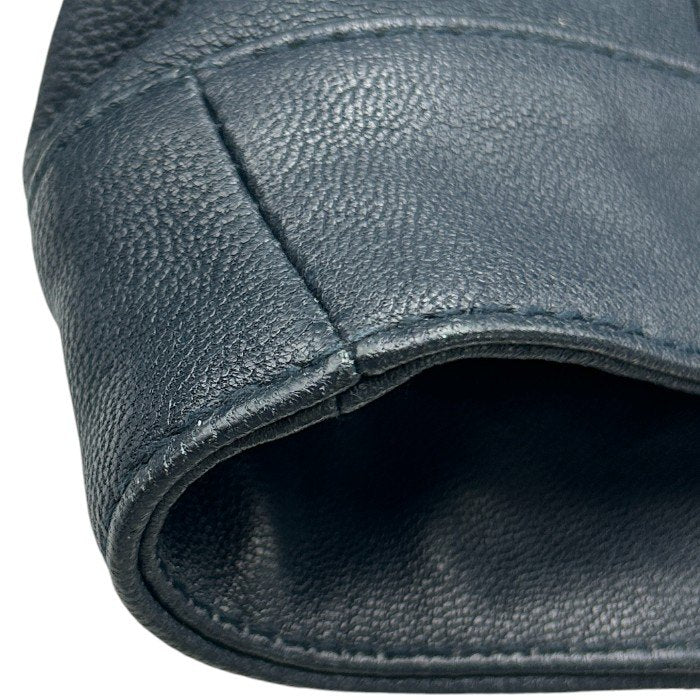 各所に擦れ、裏地まで貫通はしておりませんが袖の肩辺りの革部分に3mmほどの破れがございます。 タグに汚れがございます。 |