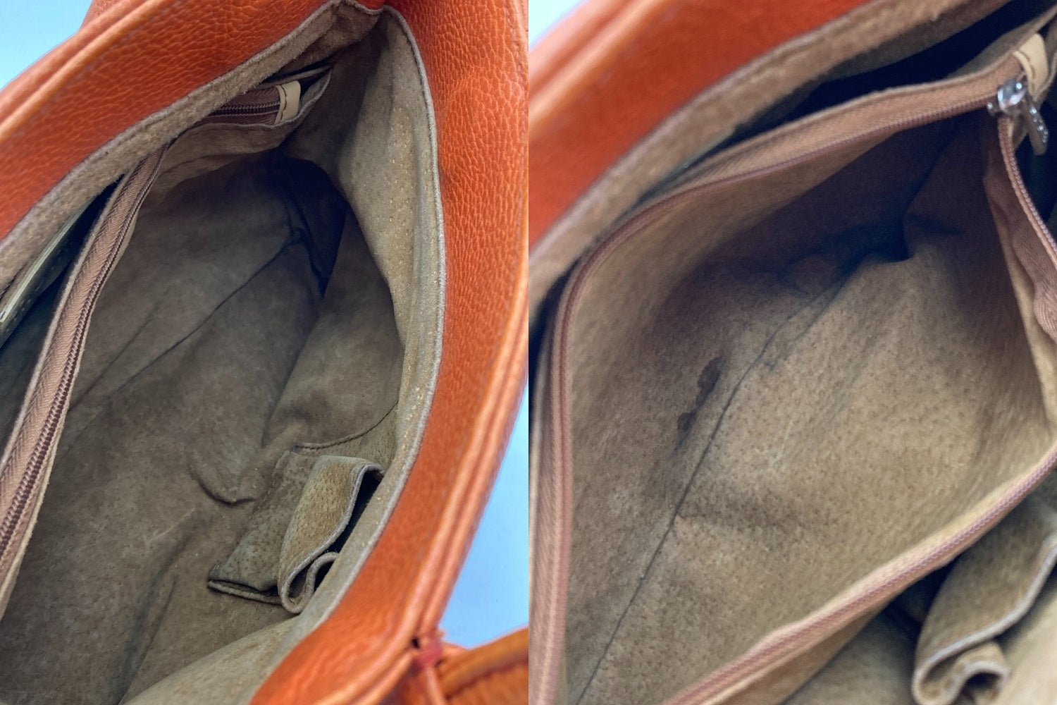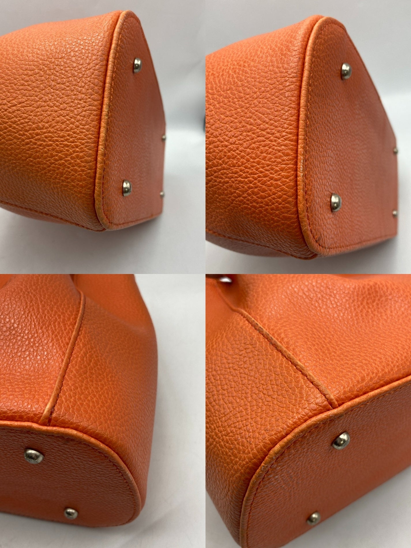 キズや汚れ、縫製のフチや角四隅に擦れがございます。 サイドや凹凸部分、持ち手に少し変色がございます。 内側に何かのこびりつきやシミがございます。 |