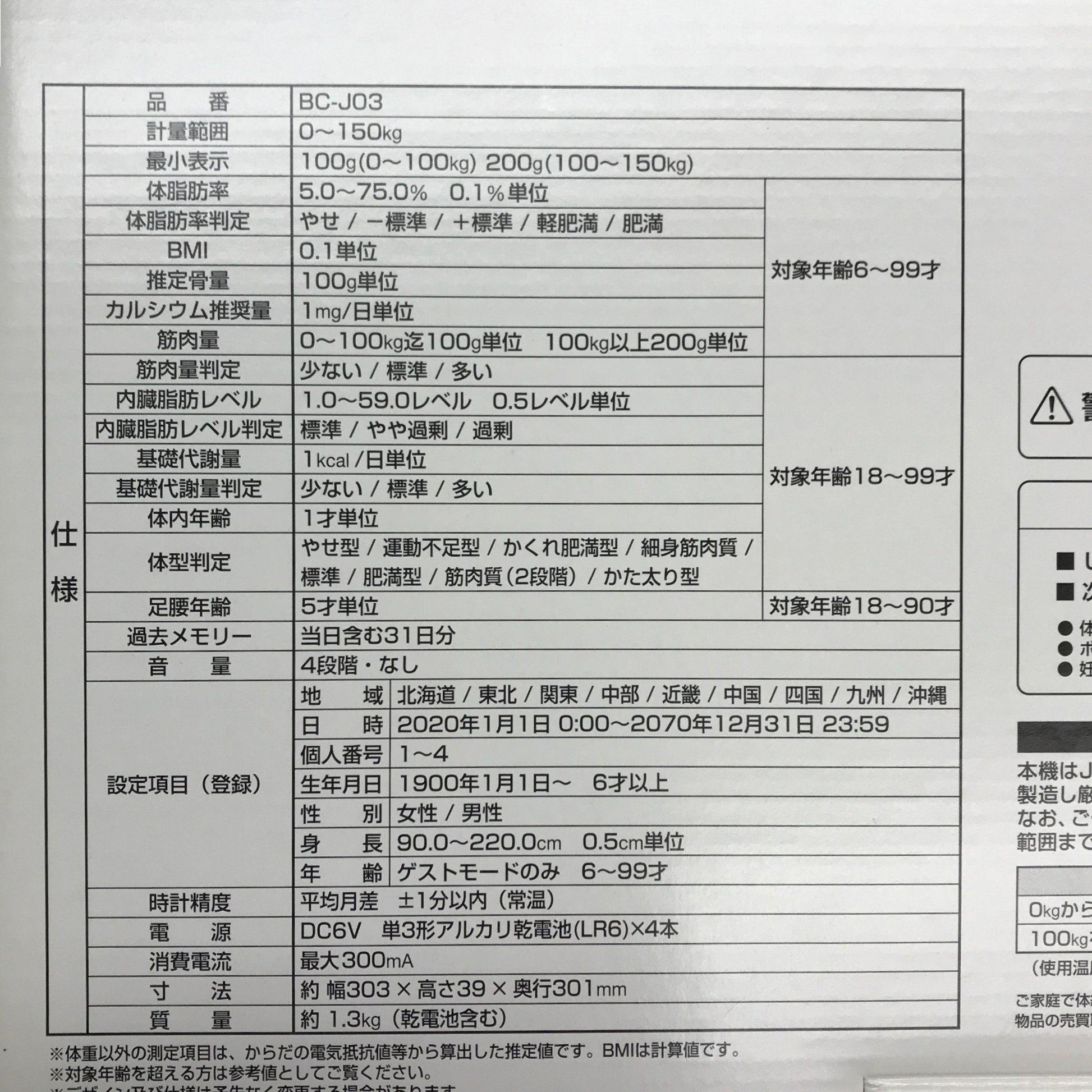 | 機能 | 体重/体脂肪率/BMI/推定骨量/カルシウム推奨量/筋肉量/内臓脂肪レベル/基礎代謝量/体内年齢/体型判定/足腰年齢/音声ガイダンス | |