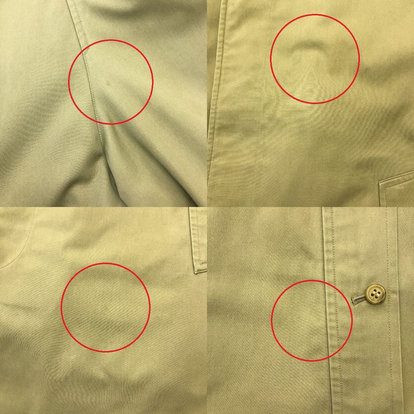 | 状態 | 前身頃に薄い汚れ、襟汚れ、袖に大きい汚れ、裏地裾に変色、袖口や裾の生地が一部擦れて薄くなっています。 | |
