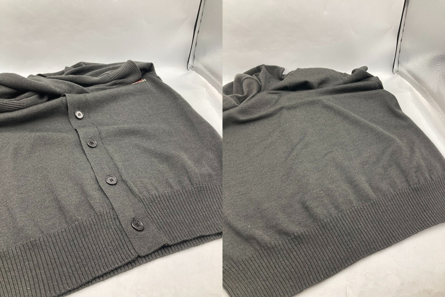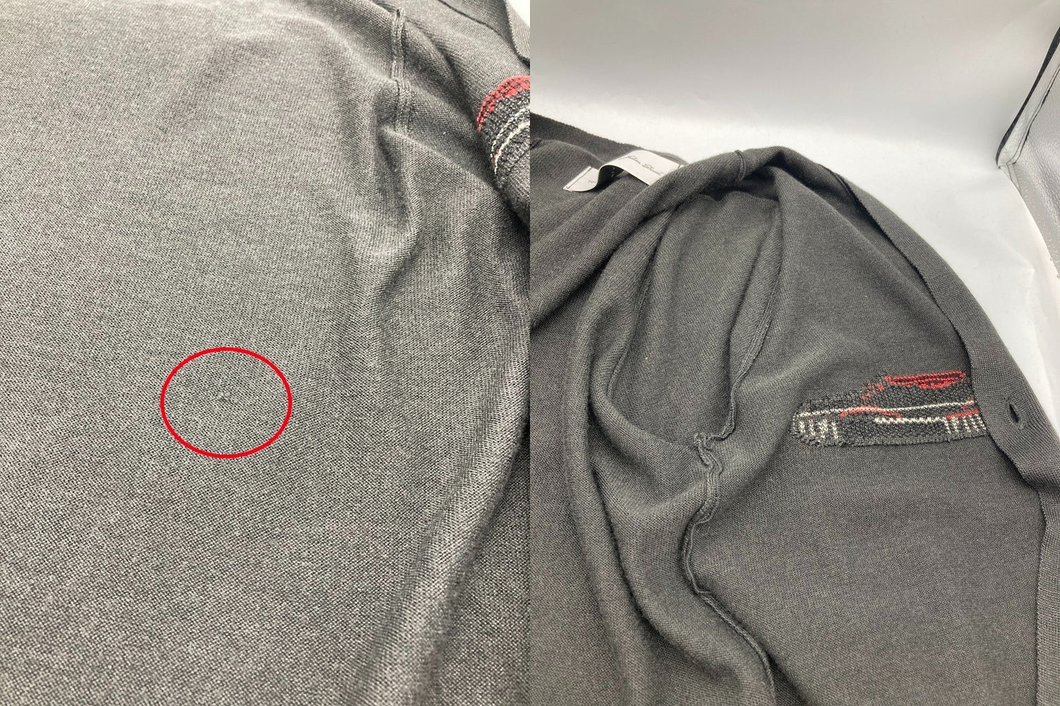 目立つような汚れはございませんが、やや毛羽立ちや裏面にコキズがございます。 ロゴタグにクリーニング跡の安全ピンの小穴が2箇所ございます。 |