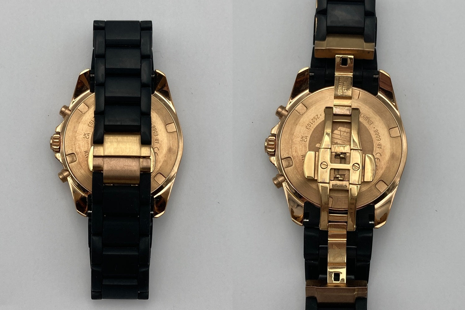キズや汚れがございます。 風防にややキズ、ベルトのラバー部分にテカリがございます。 |