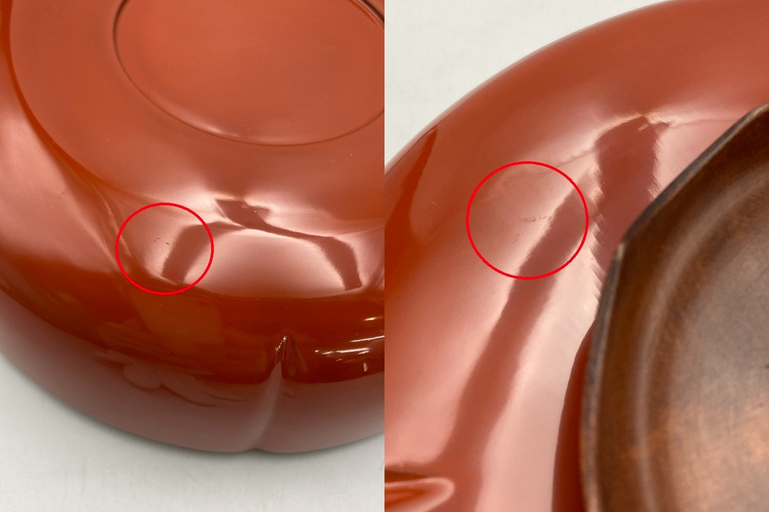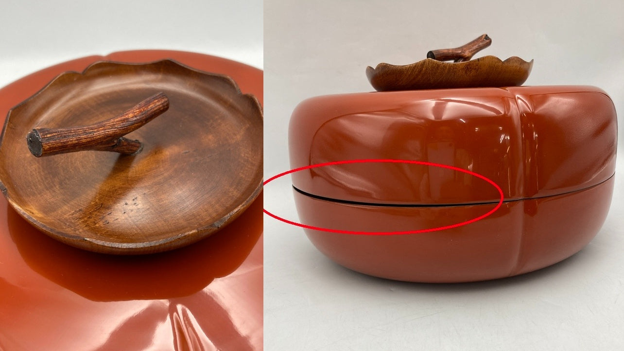 経年によるコキズや汚れが若干ございます。 菓子器本体の蓋、箱の蓋ともに反りがございます。 |