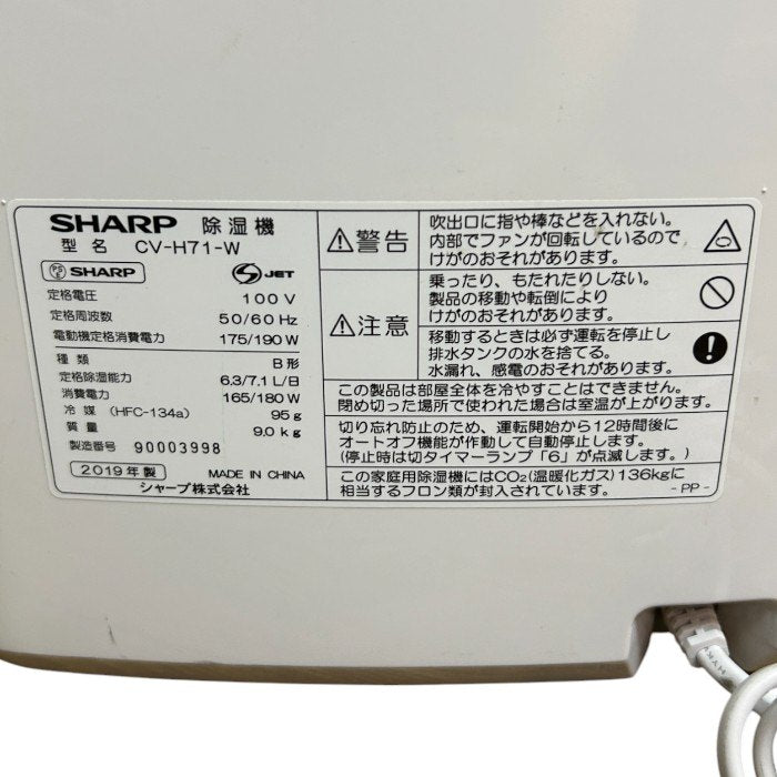 シャープ SHARP コンプレッサー式除湿機 プラズマクラスター搭載 ホワイト CV-H71-W 家電 除湿機 衣類乾燥 衣類消臭 梅雨 中古 W4