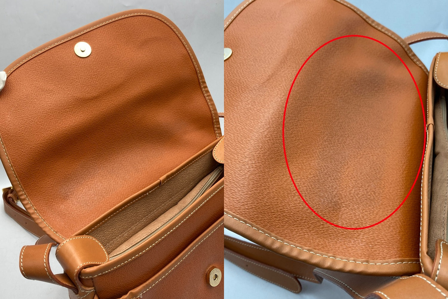 サイドのレザー部分とフラップ内側に変色がございます。 ショルダーや内側ポケットに折れ跡がございます。 折れ跡に接着剥がれがございます。 |