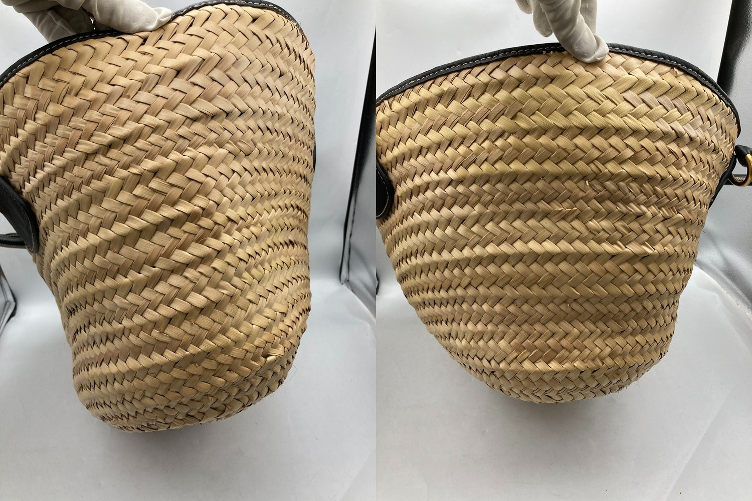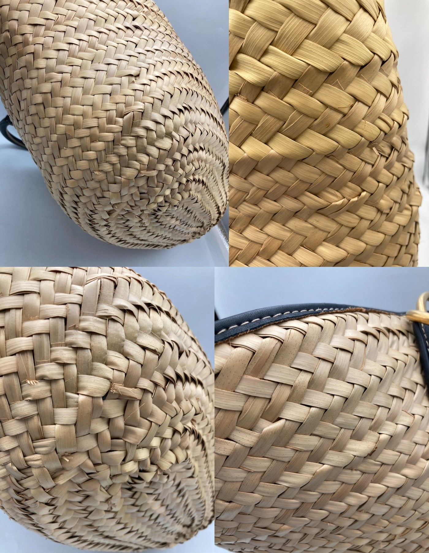 保管による型崩れがございます。 ラフィラの変色や割れ、飛び出しが全体にございます。 裏地に5~6か所程小穴がございます。 |